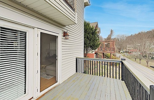 Después de un día lleno de diversión de aventuras al aire libre y visitas turísticas, regrese a casa para disfrutar de una bebida al atardecer en la terraza con vistas invernales del poderoso French Broad River
