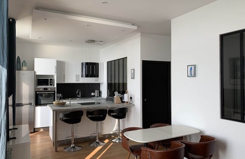 Muy luminoso con una altura de techo de 2,80 m, este apartamento es un verdadero remanso de paz. Te permite vivir al ritmo de las mareas, el ballet de las gaviotas y admirar magníficas puestas de sol.