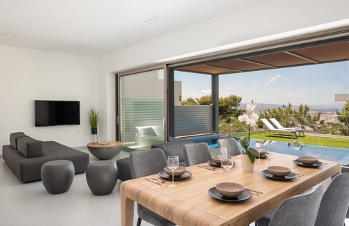 La villa "NV ONE" es un maisonete de diseño lujoso y sofisticado ubicado en posición elevada con una vista espectacular del mar y la ciudad de Chania.