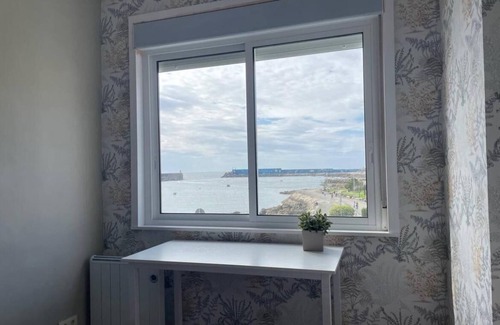 -Planta Tercera. En el tercer piso hay un salón con vistas al puerto y a la playa, sofá, televisión y mesa de comedor, la cocina está en la zona de atrás, totalmente equipada con electrodomésticos (frigorífico, horno, placa vitrocerámica, cafetera y microondas) y hay también un aseo en esta planta.