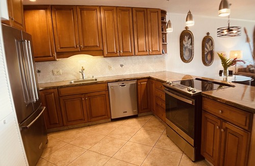 El piso principal del condominio cuenta con una cocina gourmet totalmente remodelada con encimeras de granito, electrodomésticos de última generación, utensilios y lavadora y secadora. La sala de estar está decorada con buen gusto con el efecto isla suficiente e incluye un HDTV inteligente capaz de transmitir a través de Netflix, etc y un altavoz bluetooth para reproducir desde sus dispositivos. ¡Un toldo eléctrico retráctil proporciona sombra sobre la terraza, proporcionando una 'habitación al aire libre' cómoda durante todo el día!