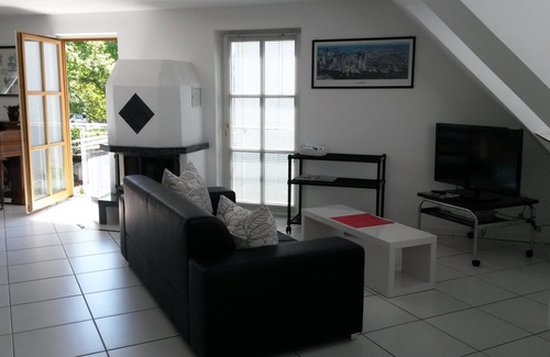 Atractivo apartamento de 75 m² en una casa de dos familias en dos niveles con baldosas y parquet, calefacción por suelo radiante, (sin aire acondicionado), chimenea y piano. La cocina está integrada en el amplio salón. El dormitorio principal está equipado con una cama doble (180 x 200), armario y armarios. Un segundo dormitorio con una cama doble (200 x 200) está en el ático. El baño incluye ducha, bañera y aseo. Ambas habitaciones tienen piso de parquet, todas las demás habitaciones tienen azulejos.