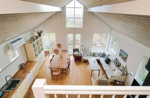 Casa de vacaciones con una ubicación fantástica en la primera fila de una playa de arena muy adecuada para los niños. La casa tiene un techo inclinado que proporciona una luz gloriosa en la sala de estar. Cocina abierta al comedor / sala de estar con estufa de leña, baño, 2 dormitorios, altillo y un 3er dormitorio en el anexo. La terraza da al agua, donde el sonido de la ducha del mar y la puesta de sol se pueden disfrutar en la terraza al máximo. Se puede jugar al ping-pong y a los dardos al aire libre cuando hace buen tiempo.