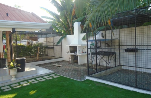 Rodeado por el conjunto de muchas plantas tropicales y nuestros numerosos loros domesticados.
