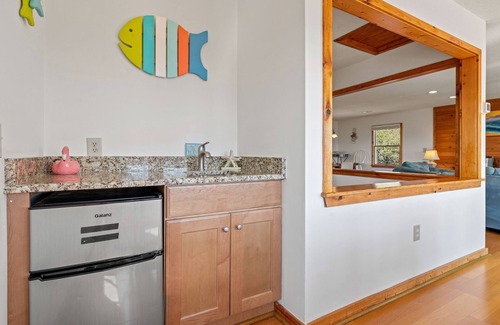 La cocina está equipada con todas las comodidades del hogar, un exprimidor Ninja Nutri-Bullet, una parrilla George Foreman, una máquina para hacer gofres, una cafetera y todos los platos, ollas / sartenes y utensilios que pueda necesitar. Un montón de asientos para comer y un wetbar.