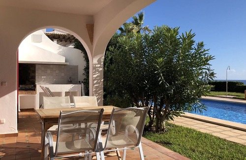 Bonito apartamento en planta baja con jardín. Tranquila comunidad de 7 vecinos. Preciosa piscina sobre el mar. Gran comedor, sala de estar con chimenea. Dos dormitorios, uno en suite. Un baño con bañera. Un aseo con ducha y un aseo con WC. Cocina totalmente equipada. Terraza con comedor exterior y tumbonas. Barbacoa.