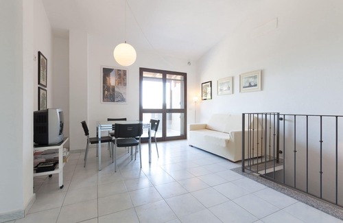 El salón con cocina americana y lavadora, sofá cama, TV vía satélite, da a un balcón con vistas a la vegetación y al mar de Santa Margherita di Pula, para almorzar o desayunar disfrutando de un espléndido panorama.