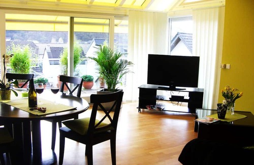 The holiday villa Näkel in Dernau is located in the Pfarrwingert vineyard position, consists of 3 holiday apartments: Pfarrwingert 75sqm Hardtberg 55 sqm Sonnenberg 45sqm (Max.14 Pers.) Fantastic view above Dernau. Kitchen u bathroom at the most modern stand. New furnished in 2010. Fruit, berries and grapes for picking yourself in the garden. Fantastic living in the "Pfarrwingert" apartment (EC/Hanglage), which leaves nothing to be desired. Relax with excellent wines and regional dishes in the Mediterranean ambience of the Gutenschenke. Bathroom (shower panel with a head shower, massage nozzle) and kitchen on the latest stand with small helpers, spices, coffee/tea etc. Sufficient towels, beds freshly covered, fluffy bathrobes (baby bed and children's high.