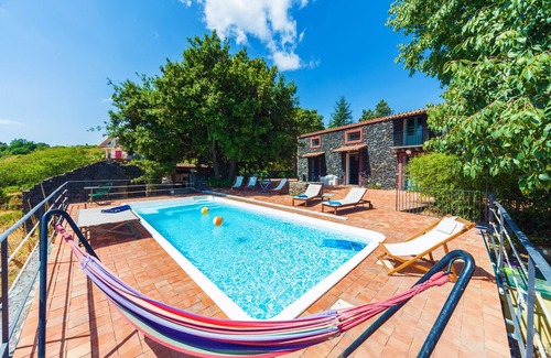 La vista impresionante de la costa jónica, el Golfo de Taormina y la península italiana hacen que el paisaje que se ve desde la villa única. Trate sólo para imaginarlo! La villa está completamente construido de piedra de lava. Se desarrolla en 2 plantas, tanto luminosas, amplias y agradables. En la primera planta se encuentran: un amplio salón, una cocina, un baño, una despensa, una biblioteca maravillosa y una habitación con dos camas individuales, una de ellas de una plaza y media. En el segundo piso hay dos suites con baño privado. El interior está decorado con buen gusto, como se puede ver en las fotos. El exterior de la villa es una inmersión con encanto en el horizonte azul profundo. Hay varios rincones fascinantes, incluyendo: la zona de la piscina entre la imponente fachada de piedra de lava, el golfo de Taormina y el mar Mediterráneo; la zona de barbacoa con el horno de piedra típico (ideal para pizza); muchos salones se relajan ... Todos completamente inmersos en un parque típico de Etna (robles, castaños, Melicuccoe - Minicucco en siciliano - ...)
