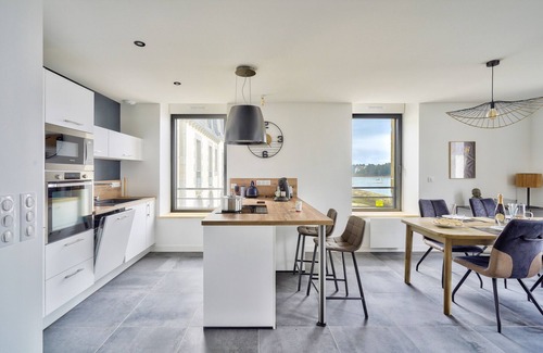 La vista de 180° desde este apartamento tiene vistas al agua. Te sorprenderá esta auténtica postal con vistas al océano y al río que, durante todo el día, ofrece una luminosidad asombrosa.
