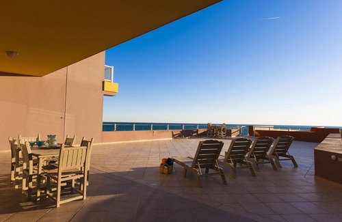 Esta planta baja de 2 dormitorios / 2 baños vacaciones de ensueño de alquiler es tan cerca del mar que se puede encontrar en Las Palomas. El condominio cuenta con un gran tamaño 2500 del patio con salida al exterior pies cuadrados que se extiende hasta el borde de la playa y es ideal para familias o parejas. Este es el único de dos dormitorios en el complejo con el patio amplio y verdadera ubicación frente al mar. Saltear los ascensores! Nuestras escaleras privadas conducen al lugar donde la piscina, tobogán, bar de la piscina y la playa todos vienen juntos. Es sólo unos pasos a la derecha para llegar a las piscinas, o unos pocos pasos a la izquierda para el bar de la piscina y la playa. Te invitamos a tirar de una de las sillas altas superiores en nuestro patio se encuentra con la playa y disfrutar de la ventaja de tener vistas panorámicas, entre el amanecer, el atardecer y el Puerto Viejo. Si desea estirar y ampliar su espacio de vida para incluir un patio mucho más grande, y una ubicación superior, entonces este condominio premium es para usted.