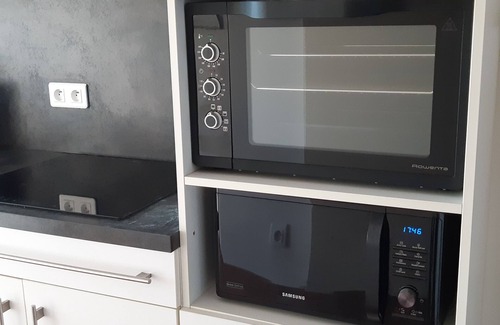 B - Cocina: moderna y funcional, abierta a la sala de estar con mostrador, nevera-congelador de 2 puertas, horno combinado microondas, placa de inducción, extractor, cafetera + cápsulas Nespresso, exprimidor de frutas, lavavajillas, lavadora.