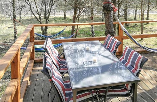 ¿Está buscando una casa de vacaciones excepcional rodeada de hermosa naturaleza para su familia numerosa? En esta casa le abrazará una naturaleza idílica. Gracias al estilo arquitectónico único de la casa, experimentará la naturaleza de cerca y tendrá la sensación de que la frontera entre el interior y el exterior se difumina. El sueño de todo amante de la naturaleza. Cocinen juntos en la moderna cocina y disfruten de deliciosas barbacoas en la terraza abierta en los días cálidos. La parcela natural vallada con grandes árboles es un paraíso para todas las almas infantiles. Déjese mecer suavemente en la hamaca, cierre los ojos y sienta la paz.