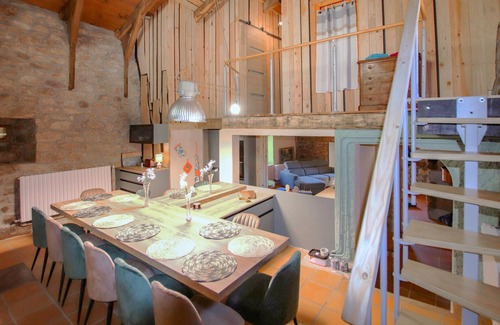 Esta auténtica y lujosa casa cerca de Saint-Étienne-de-Serre, rodeada de robles, castaños y avellanos, ofrece un oasis de paz para familias o grupos. El acogedor diseño interior de materiales nobles combina madera, piedra y hierro forjado y crea un ambiente único y acogedor. Relájese en el baño noruego o en la terraza panorámica con vistas a las montañas de Ardèche hasta los Alpes, donde podrá disfrutar de la belleza de la naturaleza en total intimidad.