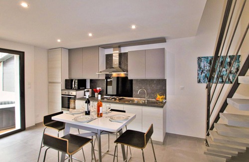 El piso es contemporáneo y ofrece un interior refinado y muy moderno con una bonita cocina americana. Las dos confortables habitaciones disponen de cuarto de baño con ducha. El pequeño jardín cerrado dispone de una agradable piscina privada bordeada por una bonita y soleada terraza de madera.