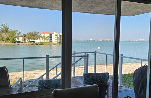 Esta propiedad está ubicada directamente en la bahía de Boca Ciega con hermosas vistas tanto de día como de noche. Hay estacionamiento asignado directamente fuera de la puerta de esta unidad de primer piso para un acceso rápido y fácil. La cubierta en la parte posterior proporciona acceso directo a una playa de arena. Una hermosa piscina y un jacuzzi con vista a la bahía brindan un lugar ideal para el sol y la relajación. Desde la cubierta se puede disfrutar de espectaculares puestas de sol frente al mar. Dentro de la unidad encontrará un condominio hermosamente amueblado con una cocina de chef moderna, muebles de cuero en la sala de estar, dos dormitorios y dos baños completos más un estudio con un sofá cama. Las vistas desde la sala de estar y el dormitorio principal son perfectas. Cuando entras por la puerta, verás que los propietarios se han ocupado de los detalles para hacer de este un gran lugar para una escapada. Cuando quiere salir, hay varias playas magníficas a solo un par de minutos en coche o a un corto paseo en bicicleta. Fabulosos restaurantes abundan en todas direcciones. ¡Esta propiedad lo tiene todo y damos la bienvenida a los huéspedes que aprecian lo mejor!