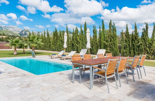 La Villa Ses Rentadores se encuentra en un entorno rural idílico en las afueras de la localidad de Selva y tiene unas maravillosas vistas panorámicas de la sierra de la Tramuntana y de algunos pequeños pueblos cercanos. Esta villa totalmente climatizada, con habitaciones diáfanas y arquitectura moderna y ligera, cuenta con 2 plantas en las que se distribuyen 4 dormitorios, 4 baños (con hidromasaje), un aseo adicional, 2 salones y una cocina muy bien equipada y ofrece espacio para 8 personas. Su valioso equipamiento incluye Wi-Fi, cuna, trona, una cama adicional (con recargo) y plaza de aparcamiento. Se permiten mascotas de tamaño pequeño. Pero su principal atractivo es, sin duda, la zona exterior con barbacoa, una piscina de 31m², un jardín mediterráneo y varios balcones y terrazas desde los que disfrutar unas espectaculares vistas del entorno. La Villa Ses Rentadores incluye todo lo que podría desear, cuenta con todo tipo de comodidades y ofrece también desayuno (con recargo). La pequeña ciudad de Selva, con tiendas, restaurantes y bares, está a pocos minutos en coche y las calas de Pollensa y Alcudia con sus playas de arena fina se encuentran a unos 30 minutos en coche.