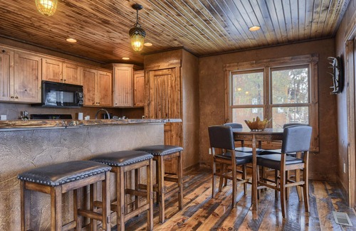 Después de explorar a lo largo de sus vacaciones, volver a casa a la cabaña será la mejor parte. Con unas vistas tranquilas desde el área de la cubierta, un área aislada en el patio trasero que bordea el servicio forestal y una bañera de hidromasaje con vista a las estrellas, sus vacaciones estarán completas. La cabina está decorada de forma rústica, e incluye muebles de registro personalizados para completar esa sensación de cabaña. Hay televisores de pantalla plana en los 4 dormitorios, pisos de azulejos con calefacción en la entrada, una chimenea con detalles en piedra en la sala de estar e incluye Wi-Fi para mantenerse conectado. La cocina abierta es ideal para el entretenimiento con capacidad para hasta 12 y hay un total de 4 habitaciones: 2 habitaciones arriba con camas queen, mientras que las otras 2 están en el nivel inferior con una cama queen y una litera doble. También hay un futón en el desván para completar la capacidad de dormir hasta 12.