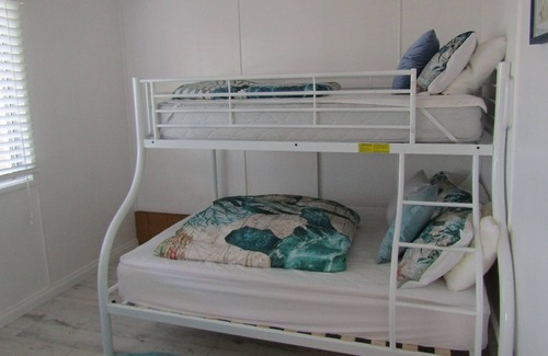 Bed configuration - UPSTAIRS - bed 1 - queen, bed 2 - tri-bunk (double on bottom single on top), DOWNSTAIRS: bed 3 - queen, bed 4 - double, bed 5 - tri-bunk (double on bottom single on top)