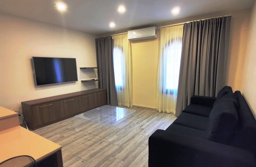 One large double bedroom with TV and air-conditioning and an en-suite bathroom with shower. Large open plan with a fully equipped kitchen and a large living area with a Tv, air-conditioning, and sofa that can be converted into a double bed.