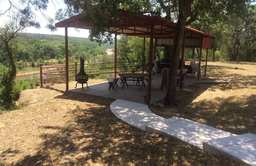 Pase un fin de semana o más en un acantilado sobre el río Brazos en el norte de Texas Hill Country del condado de Palo Pinto. Una escalera de piedra atraviesa rocas gigantes hacia el río y varios lugares de pesca, además de puntos de lanzamiento de kayak y canoa. Disfrute de una gran parrilla y vistas de la puesta de sol y el río desde un pabellón cubierto. Hay una piscina climatizada y una bañera de hidromasaje con vistas al río, entre antiguos robles vivos. También puede disfrutar de un pozo de herradura reglamentario y una cabina primitiva con capacidad para dos, ubicada en el pasto norte. A solo 90 minutos del norte de Dallas y a menos de una hora de Fort Worth, sentirás que estás a miles de kilómetros de distancia. Bienvenido a los Brazos de Dios.