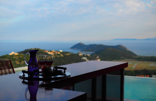 El área exterior bien diseñada, ubicada frente a la Villa, muestra una gran piscina infinita moderna y el área circundante donde nuestros huéspedes pueden tomar el sol, relajarse y disfrutar de la vista única del mar. El área al aire libre está completamente complementada con una mesa, sillas, sillones y también alberga un bar al aire libre con taburetes y una cocina pequeña, donde las misiones pueden preparar sus propias bebidas y bocadillos mientras disfrutan de la maravillosa vista de la piscina, de día o de noche.