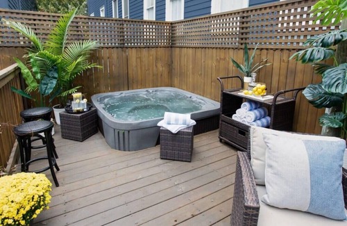 Outdoor Space: The outdoor area has a hot tub, charcoal grill, and outdoor seating area.