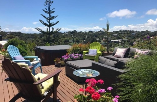 Increíble casa con sol todo el día y hermosas vistas. Paneles solares recientemente instalados para un futuro más sostenible. Esta casa se encuentra en la cima de una cresta con vistas gemelas sobre Oneroa y Surfdale. Con la adición de la piscina de spa para mantenerte cálido y relajado durante esas noches de invierno. . Tiene tres dormitorios, uno con baño privado y otro baño. Dos de las habitaciones se abren a terrazas con excelentes vistas. Las cubiertas rodean gran parte de la casa, con muebles de exterior, por lo que es un gran lugar para relajarse y descansar o disfrutar de las cenas en la barbacoa. Puede disfrutar de un vino Waiheke local mientras observa los barcos ir y venir en la bahía de Oneroa, o disfrutar de los magníficos amaneceres y atardeceres. Hay hermosos lugares ajardinados alrededor del jardín para relajarse, hay un jardín tropical en la parte delantera de la casa y atractivos jardines que rodean el resto de la casa para tomar una siesta o observar la vida de las aves.