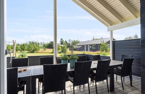Layout: cocina abierta(fogón(eléctrico), campana extractora, cafetera, microondas, lavavajillas, nevera, congelador(200-249L), secadora, lavadora), salón-dormitorio(TV(satélite, canales de televisión alemanes, canales de TV daneses), reproductor de DVD, radio, reproductor de CD, instalación estéreo, trona), dormitorio(cama doble, cama infantil), dormitorio(cama doble), dormitorio(2x cama individual), dormitorio(2x cama individual), dormitorio(2x cama individual), dormitorio(2x cama individual), dormitorio(2x cama individual), cuarto de baño(calefacción de suelo)(bañera o ducha, lavabo, váter), cuarto de baño(calefacción de suelo)(bañera o ducha, lavabo, váter), cuarto de baño(calefacción de suelo)(bañera o ducha, lavabo, váter), espacio vacío(4x cama individual plegable), videoconsola, Bañera de burbujas(dentro de la casa, climatizada, 4 personas), sauna(dentro de la casa, climatizada, 4 personas), terraza, barbacoa, piscina(dentro de la casa, 180 m2), juegos infantíl, mesa de ping-pong, futbolín, dardos, billar, calor geotérmico, bomba de calor aire-agua