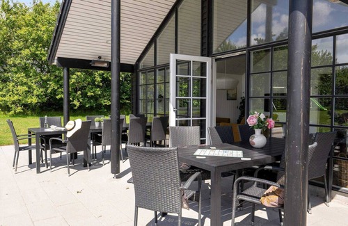 Layout: cocina abierta(fogón(eléctrico), campana extractora, cafetera, microondas, lavavajillas, nevera, congelador(60-99L)), salón-dormitorio(TV(cable, canales de televisión alemanes, canales de TV daneses), radio, reproductor de CD, instalación estéreo, trona), dormitorio(cama doble, cama infantil), dormitorio(cama doble), dormitorio(2x cama individual), dormitorio(2x cama individual), dormitorio(2x cama individual), dormitorio(2x cama individual), dormitorio(2x cama individual), cuarto de baño(calefacción de suelo)(secadora, bañera o ducha, lavabo, váter, lavadora), cuarto de baño(calefacción de suelo)(bañera o ducha, lavabo, váter), cuarto de baño(calefacción de suelo)(bañera o ducha, lavabo, váter), espacio vacío(4x cama individual plegable), videoconsola, Bañera de burbujas(dentro de la casa, climatizada, 4 personas), Bañera de burbujas(exterior, 4 personas), sauna(dentro de la casa, 4 personas), sauna(exterior), calefacción(radiador(es) eléctrico(s)), terraza, terraza(cubierta), barbacoa, piscina(dentro de la casa, 180 m2), mesa de ping-pong, futbolín, dardos, billar, bomba de calor aire-agua