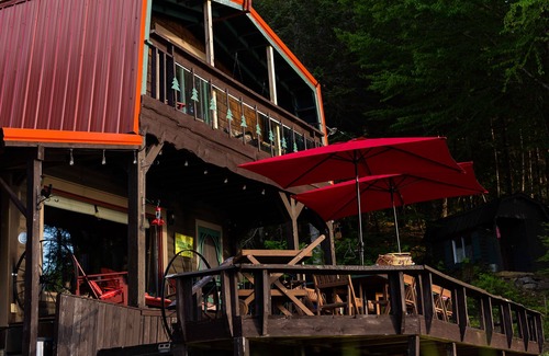 Cuando entras en la cabina, estás inmediatamente en la planta baja. La planta baja es un concepto abierto e incluye cocina, comedor y sala de estar. Todo el espacio es acogedor y tiene una sensación cálida con sus dorados pisos de pino y toques de color que incluyen rojos, verdes y crema. La cocina es espaciosa e incluye una nevera grande, estufa, microondas, cafetera y tostadora. No incluye un lavavajillas, pero tiene un encantador fregadero antiguo de granja. No hay escasez de ollas, sartenes, platos, cubiertos, etc. El salón tiene un sofá que se convierte en una cama doble, una chimenea eléctrica, ventilador de techo y televisión con reproductor de DVD (se ofrece una pequeña selección de películas). Hay un comedor lo suficientemente espacioso para seis, con un candelabro de asta de ciervo. Una estufa de leña interior para quitarse el frío cuando hace frío, se proporciona un suministro de madera. Un gran ventanal da al lago con impresionantes vistas.