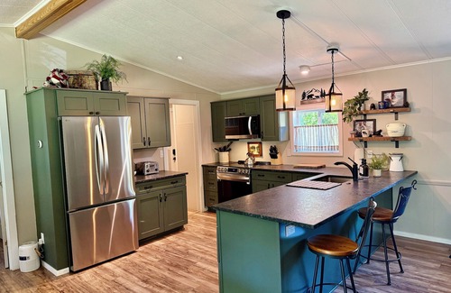 Las habitaciones de Riverfront Gem with Big Deck, Fishing & Adventure. Comfy beds, upgraded beauty disponen de aire acondicionado, cafetera y tetera y secador de pelo. Las habitaciones disponen de patio. La cocina está dotada de frigorífico, placa de cocina, microondas y utensilios de cocina.