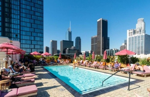 Step into the heart of Los Angeles with a romantic high-rise retreat that offers sweeping city views, a private balcony, and access to luxurious amenities like a rooftop pool, gym, and steam room.