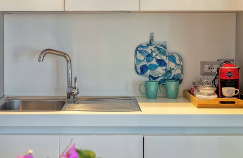 Cocina completamente equipada con electrodomésticos modernos, ideal para preparar platos locales y disfrutarlos con vistas a la bahía.