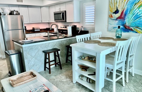 Este es un hermoso y moderno complejo de baja densidad con un lugar de estacionamiento asignado debajo del edificio. La cocina está totalmente equipada y ofrece hermosas encimeras de granito y elegantes electrodomésticos blancos. La sala de estar y comedor tiene una pantalla plana de 55 pulgadas Smart TV, sofá cama Queen, sillón reclinable giratorio, mesa de la cocina para cuatro personas y área de bar adyacente con dos taburetes de la barra para asientos cómodos para seis.