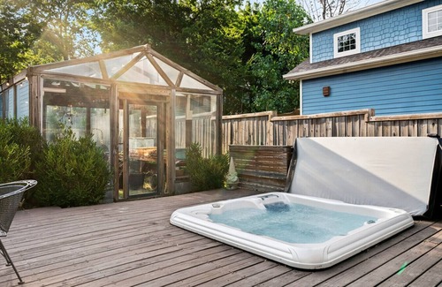 Step outside to enjoy an indoor-outdoor dining area, propane grill, and fire pit (firewood stored in the greenhouse — chopping required). While the glass greenhouse is locked for safety, it adds a unique charm to the garden views.