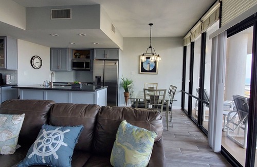 Ven y relájate en este elegante condominio de 2 dormitorios y 2. 5 baños. Las habitaciones son king y dos camas de tamaño completo, con capacidad para 6. Cada habitación tiene un televisor de pantalla plana más una puerta corrediza de vidrio con acceso a un balcón privado en el quinto piso con vista a la Bahía Laguna Madre. El baño principal tiene una cabina de ducha con azulejos de vidrio. El segundo baño tiene una combinación de bañera y ducha con azulejos de vidrio. Cocina acogedora y funcional con todos los electrodomésticos de acero inoxidable, gabinetes a medida con encimeras de granito. La cocina completamente equipada incluye cafetera, licuadora y tostadora, vajilla, cristalería, utensilios para hornear y cubiertos. El área de comedor incluye una mesa de comedor para 6 personas con 2 taburetes adicionales alrededor de la isla de la cocina. Combo de lavadora / secadora apiladas de tamaño completo incluido. La sala de estar está amueblada con un sofá de cuero, un sofá de dos plazas, un sillón reclinable y una pantalla plana T. V. Salga al balcón y disfrute de la vista del Golfo mientras toma el sol con muchos asientos en el balcón disponibles.