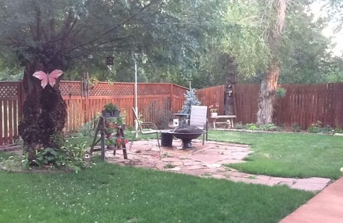 Este alquiler es parte de nuestra hermosa casa a pocos pasos de los senderos del Jardín de los Dioses. Cuenta con un amplio dormitorio con techo abovedado con 2 tragaluces, ventilador de techo y amplio baño principal. Hay una zona de loft con un sofá cama. La habitación cuenta con un agradable escritorio enrollable, configurado para su computadora portátil con un teclado y mouse inalámbricos. En la planta baja hay una amplia sala de estar con una gran televisión de alta definición. Hola velocidad de internet inalámbrico. Hay una pequeña cocina con una mini nevera, microondas y horno tostador. No hay estufa. Desde la cocina, sales a un patio semiprivado compartido con los propietarios, con una bañera de hidromasaje para disfrutar. En la parte trasera hay un patio encantador que está completamente cercado, y tiene un bonito pozo de fuego y un gran patio de concreto además de camas plantadas que rodean el césped y al lado del patio. Todas las tarifas de limpieza están incluidas en el precio, excepto la tarifa de limpieza de $ 25 para mascotas.