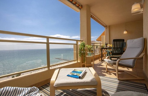 Precioso apartamento para 7 personas en primera línea de playa, a escasos 100 metros del mar, situado en la planta 17, con increíbles vistas panorámicas de la playa, con una preciosa terraza con dos zonas, una habilitada como zona comedor, para desayunar y cenar disfrutando de las vistas y el sonido de las olas, y otra zona de chill-out para relajarse con vistas al mar.
