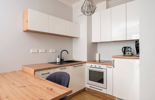 Solidarności Skyline Apartment is a practically designed apartment featuring a living room with a sofa bed and a kitchenette, a bedroom with a king-size bed and desk, a bathroom, and a spacious balcony where guests can relax with a morning coffee or an evening glass of wine. Guests can enjoy a variety of amenities, including Wi-Fi, terrestrial TV, a washing machine, iron, hairdryer, kettle, induction hob, fridge with freezer, oven, capsule coffee machine, and kitchenware. Additionally, the apartment is equipped with air conditioning, providing exceptional comfort, especially during hot days.