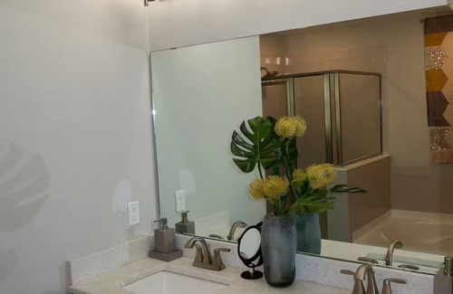 Prepara una comida casera en la cocina, equipada con horno, placa de cocina y frigorífico, además de máquina de hielo, microondas y utensilios de cocina. Disfruta del wifi y de la televisión. El cuarto de baño incluye toallas, papel higiénico y jabón. Y gracias a la lavadora y la secadora, podrás viajar con poco equipaje. Otras comodidades de este alojamiento de 4 dormitorios y 3 baños incluyen ropa de cama, una tabla de planchar, aire acondicionado y calefacción.