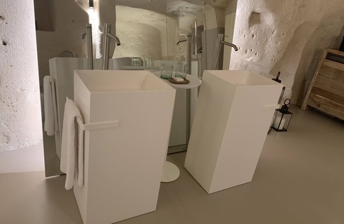 Esta suite de 90m2 está completamente pulida de la roca calcárea que hace que los Sassi de Matera sean tan famosos y tan especiales.
