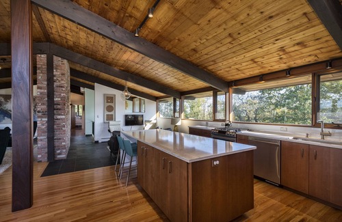 Este moderno Deck House de mediados de siglo cuenta con un plano de planta abierto, techos altos con ranura y lengüeta y pisos de madera noble. Hay enormes ventanas de caoba en todas partes, de hecho, grandes paredes de vidrio que naturalmente dan la bienvenida al exterior. La vista desde cada habitación es una obra maestra de la naturaleza.