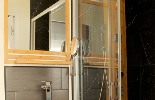 Baño privado con ducha de masaje en mármol y bambú, cama king size en 160. Cocina, nevera, tostadora, cafetera, tetera, microondas, plancha, televisión de pantalla plana con Netflix y conexión wifi. Posibilidad de tomar un desayuno completo en el sitio.