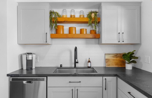 Inside, you'll find a fully furnished and thoughtfully stocked home designed for comfort and ease. The open living space flows into a full kitchen equipped with everything you need, including a Keurig coffee maker for your morning cup, Magic Bullet Blender, and all of the essentials you need to whip up your favorite meal. Enjoy the convenience of an in-unit washer/dryer, high-speed internet, driveway parking, electric fireplace (for added ambiance for those cozy movie nights), and window AC units with ceiling fans to keep your stay comfortable year-round.
