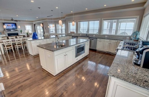 ¡Guauu! Otra propiedad fabulosa frente al mar por expertos locales en la construcción de lujo! "Aquatic Dreams" se distingue por un plano de planta distintivo con espacio habitable en el nivel medio y habitaciones en el nivel superior. No se preocupe por la vista porque la gran sala y la cocina ahora abarcan todo el lado del océano y las vistas panorámicas hacen que cocinar incluso para 29 sea un placer. Hay una gran cocina en comparación con la mayoría de las propiedades de alquiler. Una gran isla central con otro fregadero hace que sea fácil encontrar un montón de ayuda para la preparación de las comidas, mientras disfruta de la excelente vista del océano. La cubierta tiene una cabaña cubierta con mesa para comidas, bebidas y pasar el rato con vistas a la piscina y al océano. Los muebles de calidad lo alentarán a pasar la mayor parte del tiempo al aire libre ... relajándose y relajándose con la familia.