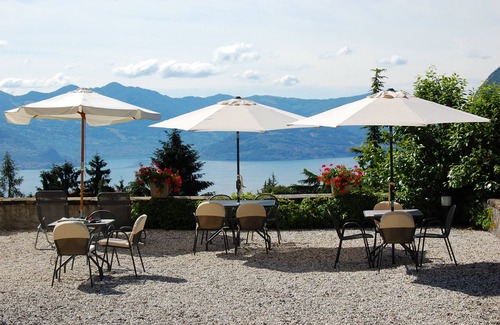- Gran jardín y solarium público con sombrillas y mesas, con vista al lago;