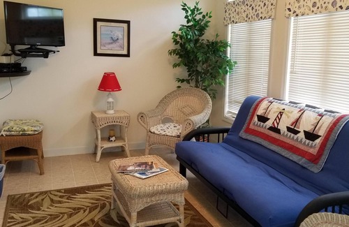 Nuestro condominio está convenientemente ubicado en la ruta 1 entre Lewes y Rehoboth Beach, Delaware. Nuestro condominio está cómodamente decorado con mullidos muebles de sala de estar, 2 camas queen y 2 camas individuales, habitación Florida con futón, muebles de mimbre y mucha luz solar. Relájese en el patio y disfrute de la vida silvestre en el estanque o camine hacia la nueva piscina comunitaria para darse un chapuzón fresco.