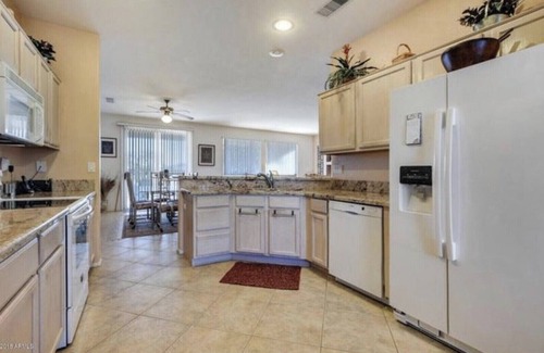Espectacular vista sobre el campo de golf y las montañas desde el patio. Plano de planta de concepto abierto ideal para el entretenimiento. Comedor asientos para 16. Muebles de lujo, pared de medios con TV y chimenea. Encimeras de granito. Cocina completamente equipada, garaje para dos autos y CARRO DE GOLF. La casa está equipada con 4 televisores de pantalla plana, servicio de Direct TV por satélite, wi-fi i e internet. Los servicios públicos como gas, agua, alcantarillado, recolección de residuos, internet y televisión por satélite, así como el mantenimiento del paisaje, están incluidos en el alquiler. Un gran patio con sombra tiene una parrilla de barbacoa de propano y asientos para 10 personas. El patio, ajardinado con naranjos / limoneros / árboles de mandarina, palmeras, arbustos y plantas del desierto se riega durante todo el año con un sistema automático de riego por goteo. Sun City Grand es una comunidad de adultos con cuatro campos de golf de 18 hoyos diseñados por el fallecido Billy Casper: Granite Falls North, Granite Falls South, Desert Springs y Cimarron. También incluye canchas de tenis, centros de entrenamiento, piscinas, restaurantes, etc. Nuestra casa está ubicada a cinco minutos en automóvil del Centro de recreación de Adobe, que cuenta con 3 piscinas, un gimnasio, una pista interior para caminar, una sala de yoga ... Es la sede de actividades como Puente, tenis, clubes y el Sonoran Center con música y representaciones teatrales. Los inquilinos también pueden usar el Centro de recreación de Cimarrón, que también se encuentra a 5 minutos en automóvil de la casa con piscinas, centro de ejercicios, masajes, tenis, etc. Los inquilinos tienen acceso a los servicios y campos de golf mediante el pago de una tarifa única de $ 125 por persona a la Asociación de Propietarios de Viviendas (HOA). El estadio Sorpresa, a pocos minutos, es el centro de entrenamiento de primavera para los Reales de Kansas City y los Rangers de Texas.