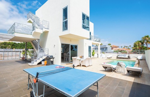 Sunset Escape situata sulla soleggiata costa meridionale di Tenerife questa splendida villa si erge come un faro di lusso e tranquillita .La sua immacolata facciata bianca sullo sfondo azzurro dell'oceano Atlantico offre viste mozzafiato che si estendono fino all'orizzonte .L'ampia terrazza offre un ambiente idilliaco per guardare i tramonti dorati che colorano il cielo ogni sera.Rilassati sulla terrazza solarium e goditi le viste meravigliose